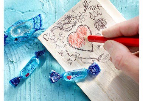 Emballage typique avec la cellophane bleue et le coeur rouge.