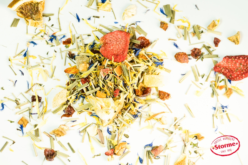 Appel, ananas, citroengras, rozenbottel, sinaasappelschil, munt, sinaasappelstukken, goudsbloemen, aardbei, korenbloemen, saffloerbloemen